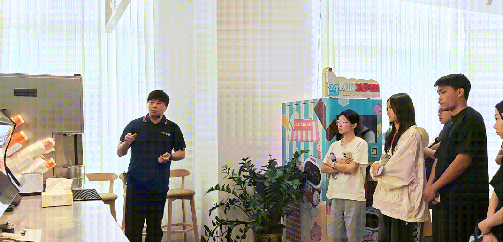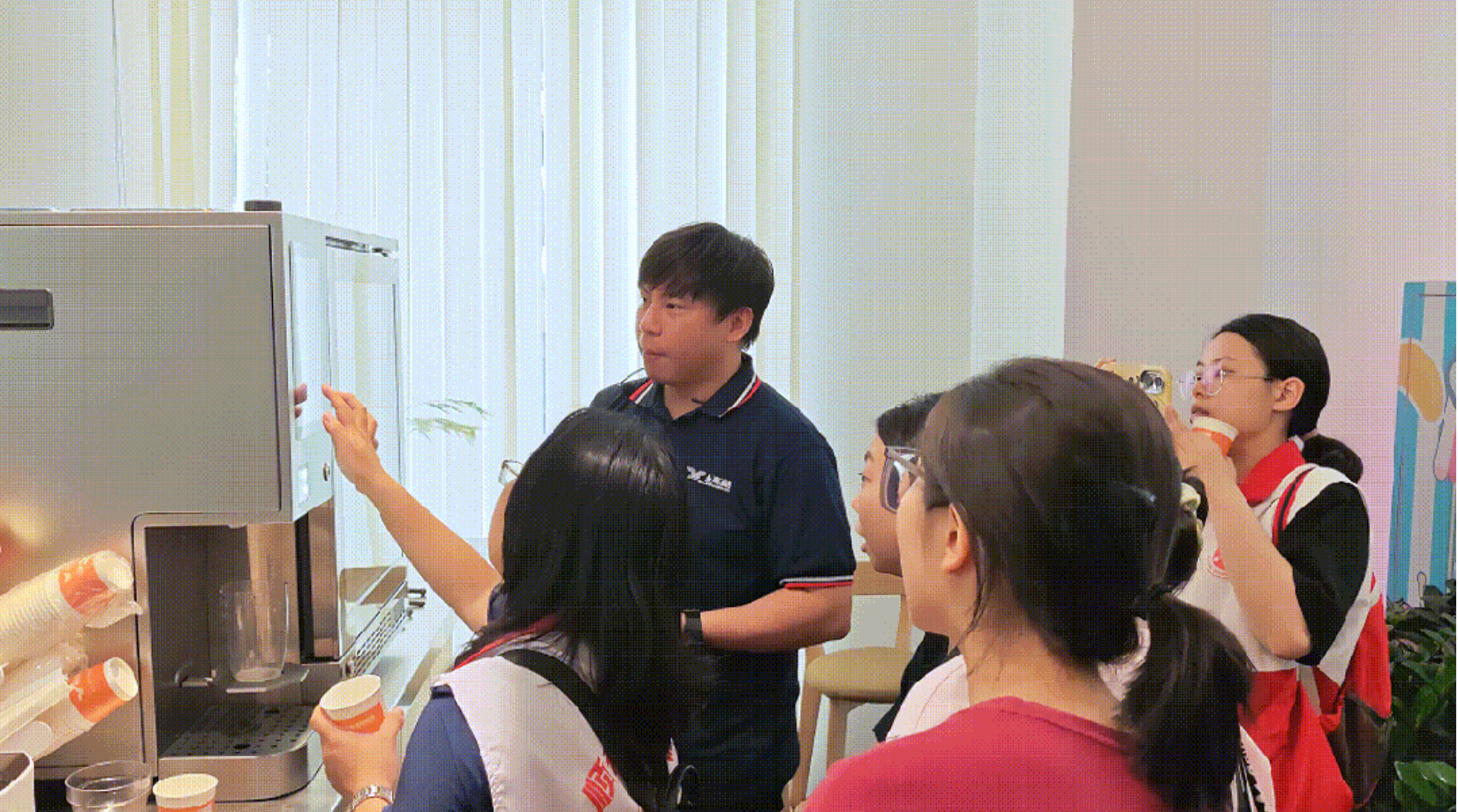 最令学员们兴奋的环节,莫过于“亲手智造一杯奶茶”! 在永亮自主研发的E型智能奶茶机前,学员们跃跃欲试。只需轻轻一按,短短6秒! 这台高度智能化、操作极简的设备,就精准完成了配比与制作,一杯属于自己的饮品新鲜出炉。“太快了!”“太方便了!”“这‘智造’太厉害了!” 学员们的惊叹声此起彼伏。这个“一键智造”的沉浸式体验,将创新科技的魅力以最直观、最有趣的方式,深深烙印在年轻一代的心中。