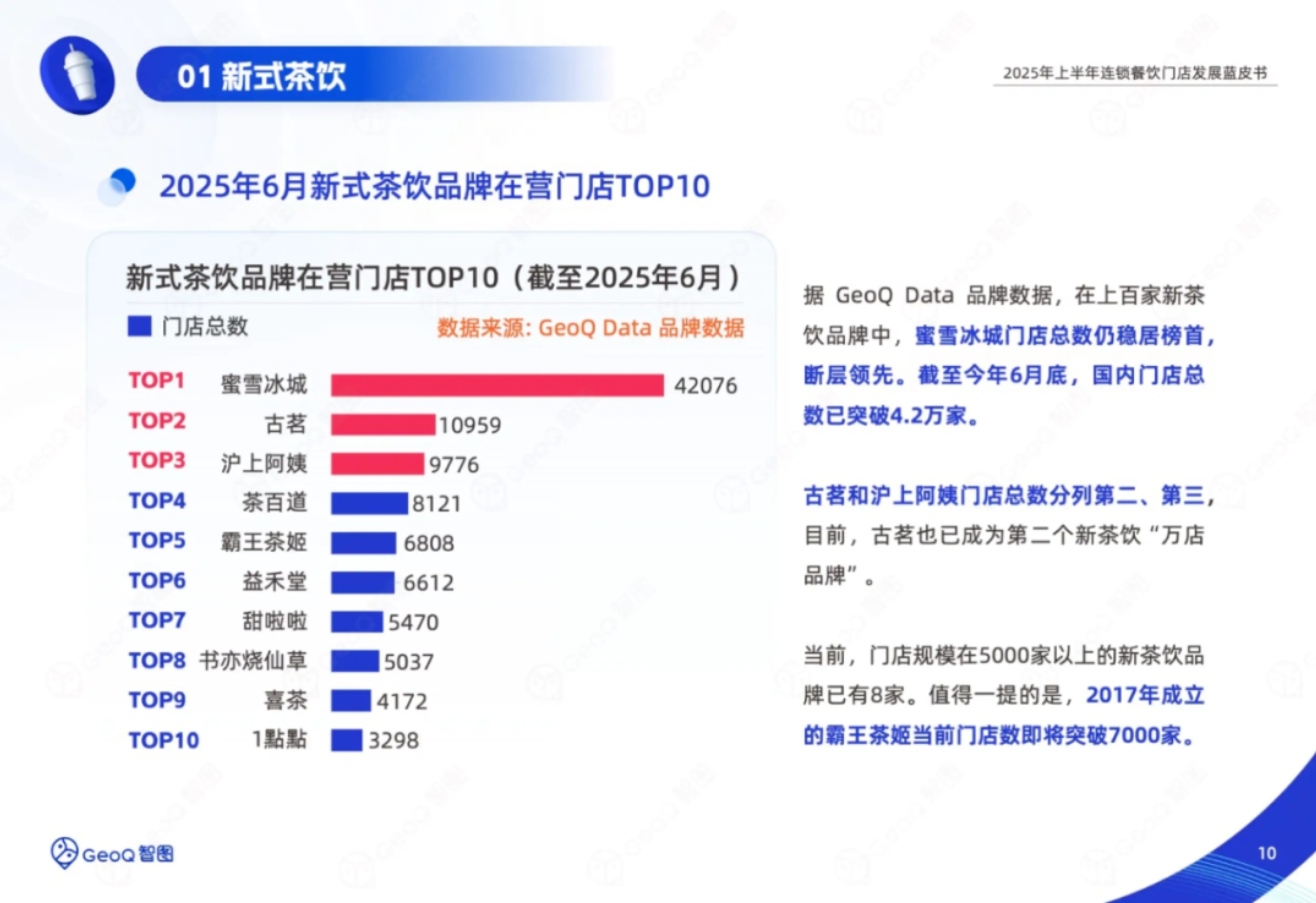 据GeoQ Date品牌数据显示,截至今年6月底,全国门店总数排名前五的品牌为蜜雪冰城、古茗、沪上阿姨、茶百道以及霸王茶姬。
