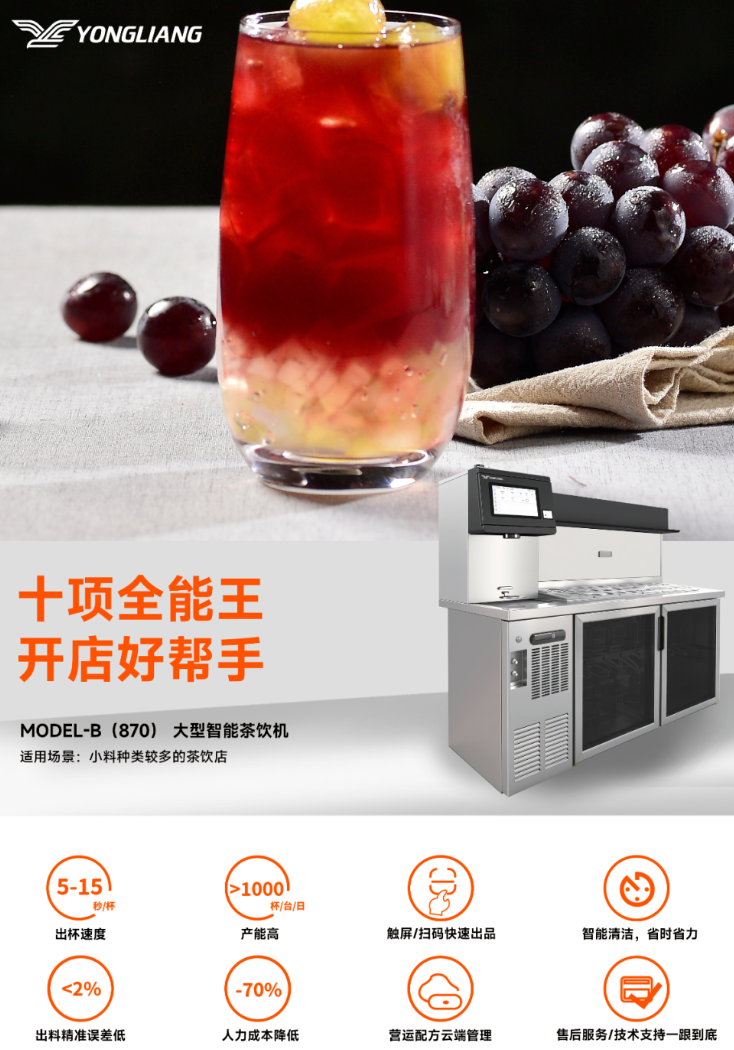 智能茶饮机已不再是锦上添花的“奢侈品”,而是中小品牌在红海血战中“活下去”甚至“活得好”的关键胜负手。它解决的不仅是人工效率问题,更是中小品牌在巨头阴影下,实现标准化、降成本、稳品质、抗风险的综合生存能力升级。