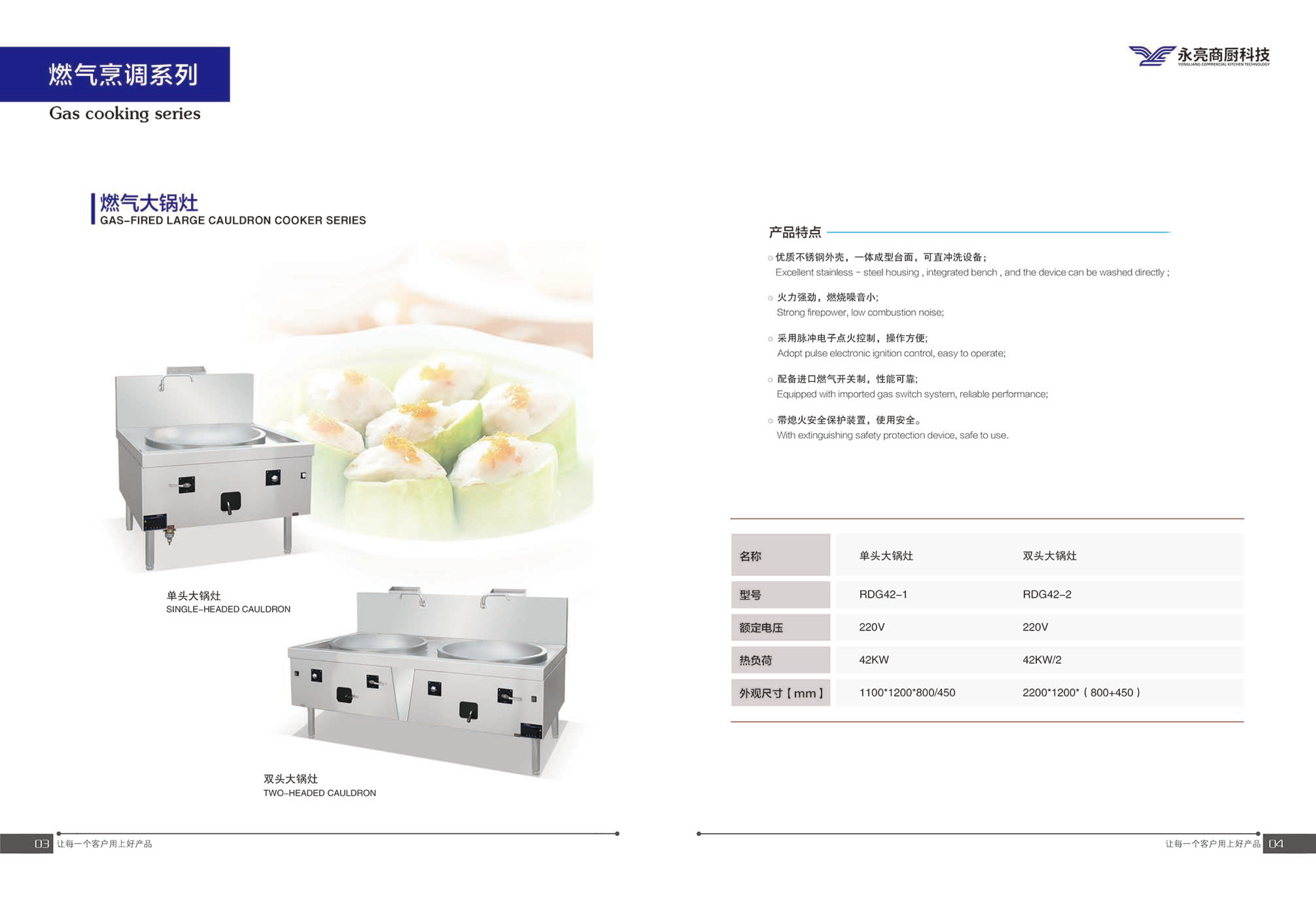 ① 优质不锈钢外壳,一体成型台面,可直冲洗设备; ② 火力强劲,燃烧噪音小; ③ 采用脉冲电子点火控制,操作方便; ④ 配备进口燃气开关制,性能可靠; ⑤ 带熄火安全保护装置,使用安全。
